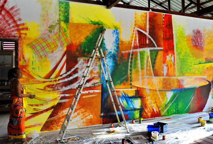 My preference for Asian, African and Indigenous influences is rooted in my homeland. I work with acrylics on canvas and occasionally add various materials that I find in the woods, the water, or on the ground. Suriname and my environment are my greatest muses. An old dugout canoe, driftwood, an old chair… it doesn’t matter. Endlessly fantasizing about the second or third life of an object, I just can’t get enough of it!